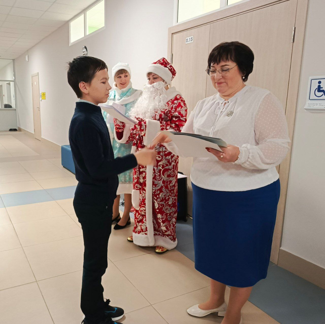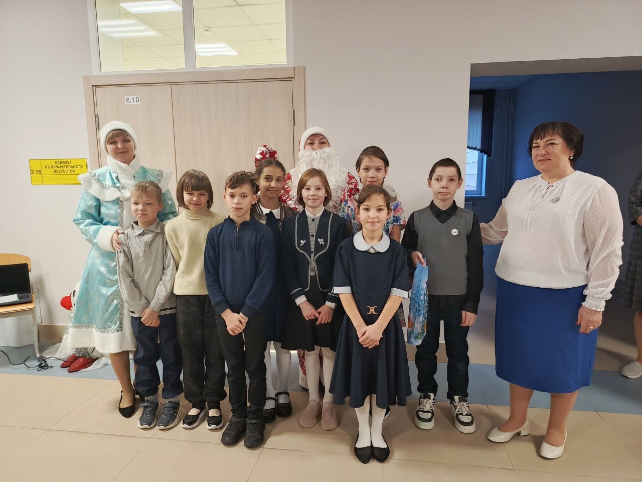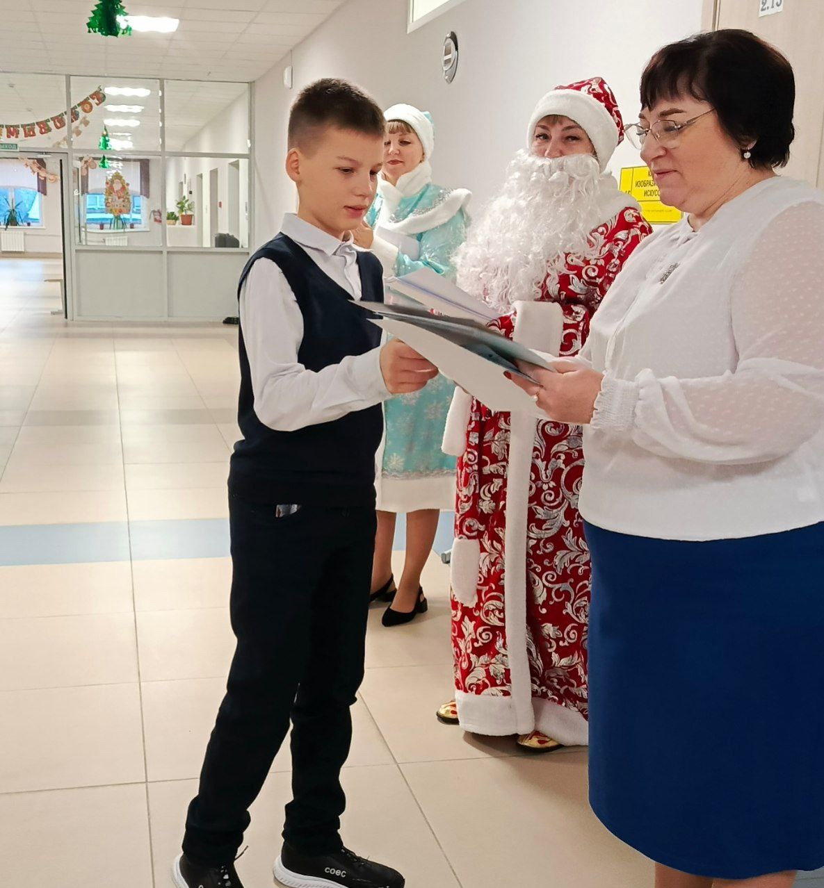 Всё началось с итоговой утренней линейки. Как только директор школа Табунова Н.А. поздравила всех с окончанием четверти, года, напомнила про соблюдение правил безопасности в период каникул, в гости пришли Дед Мороз и Снегурочка!