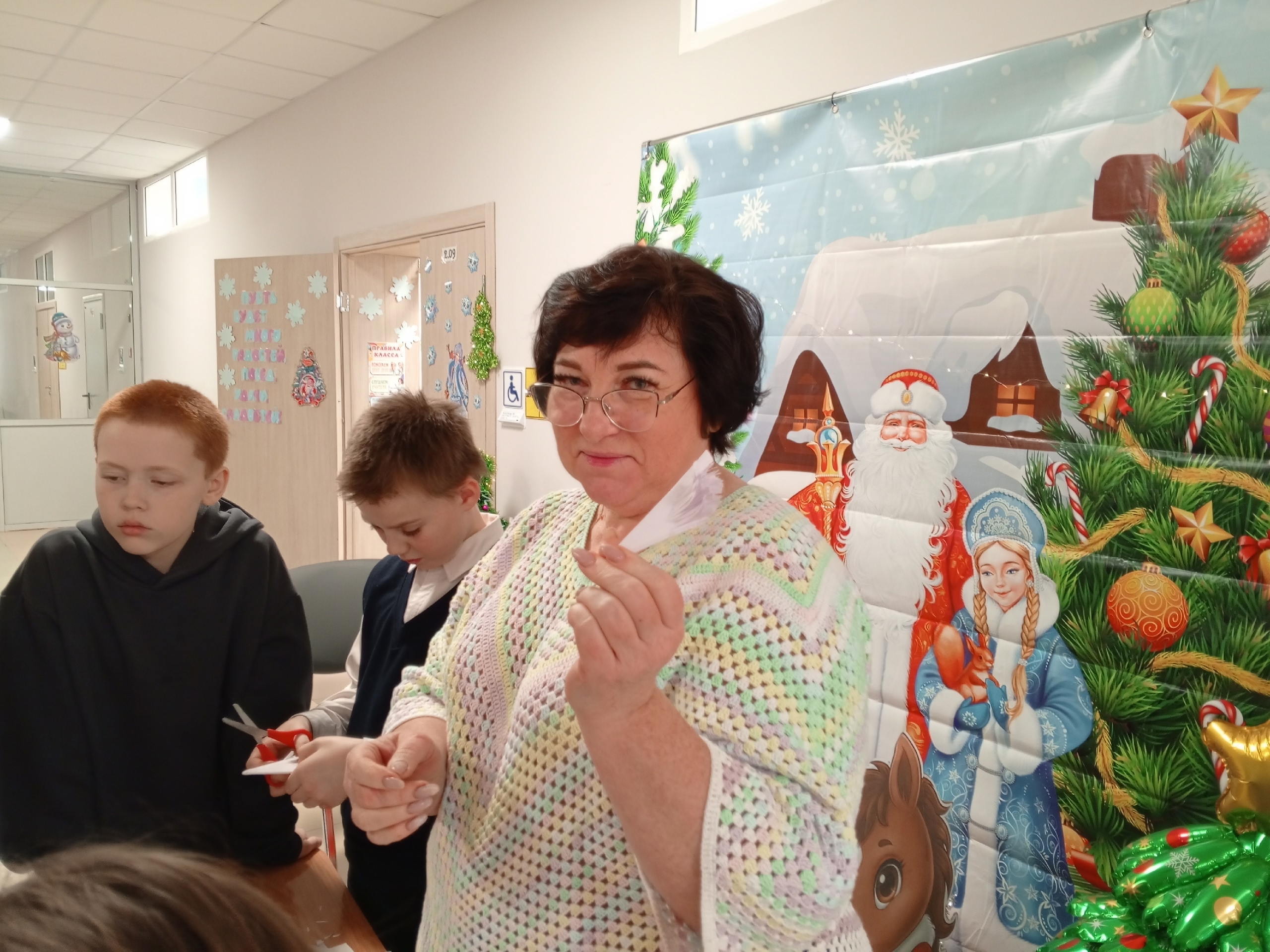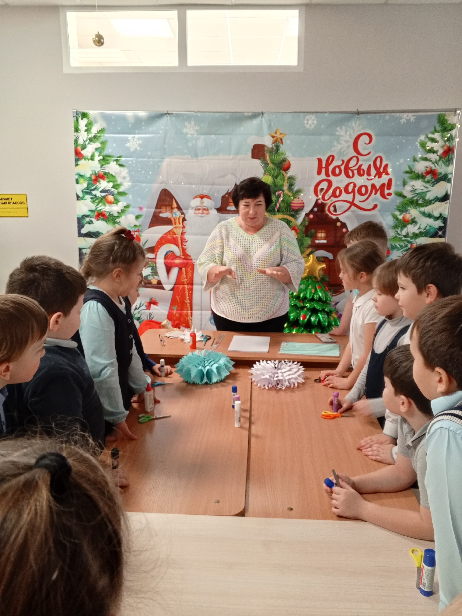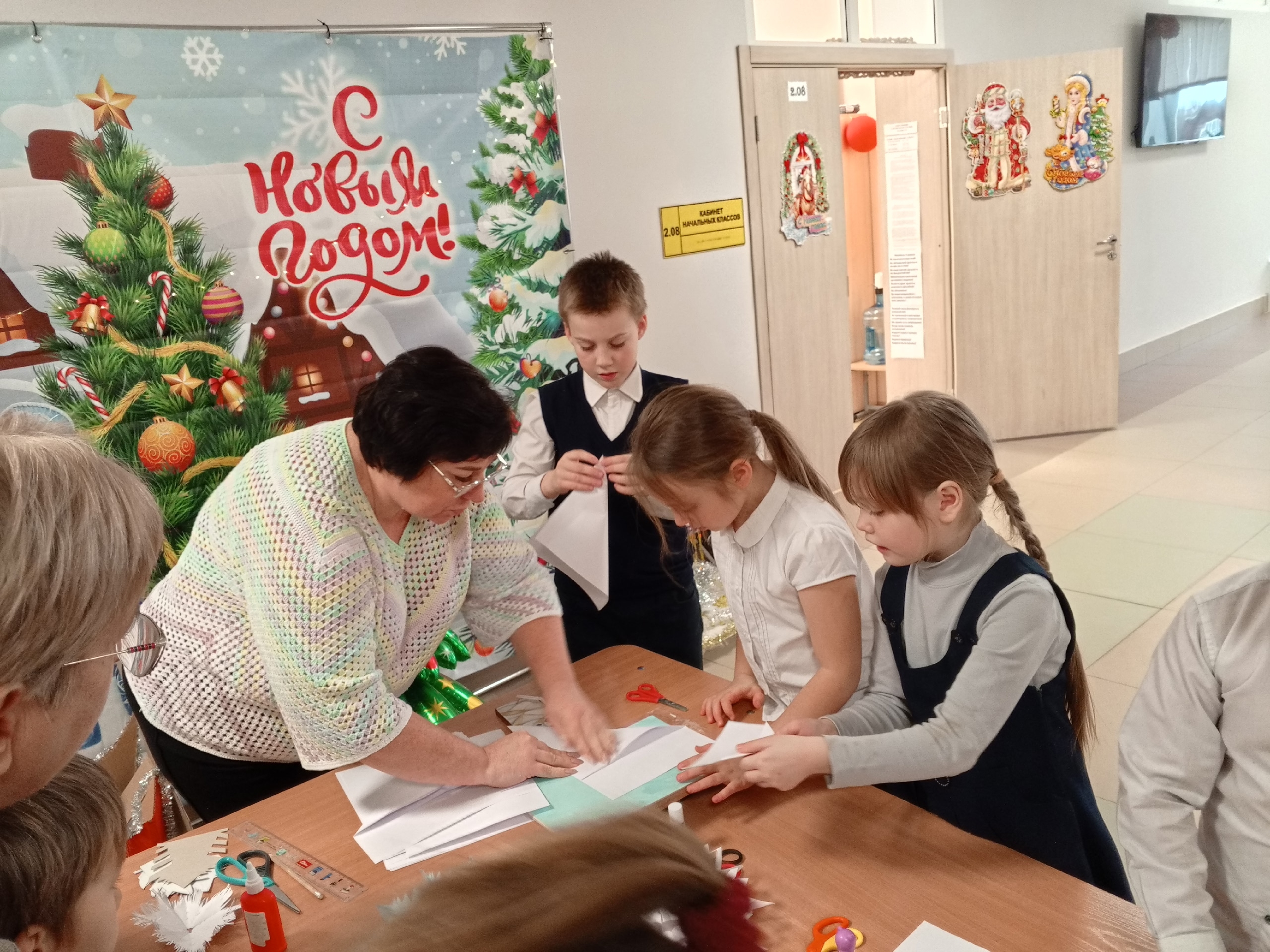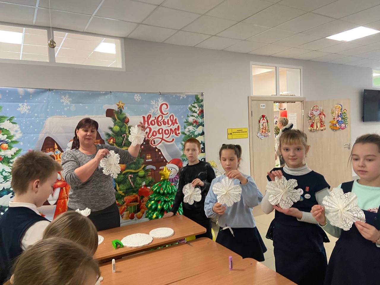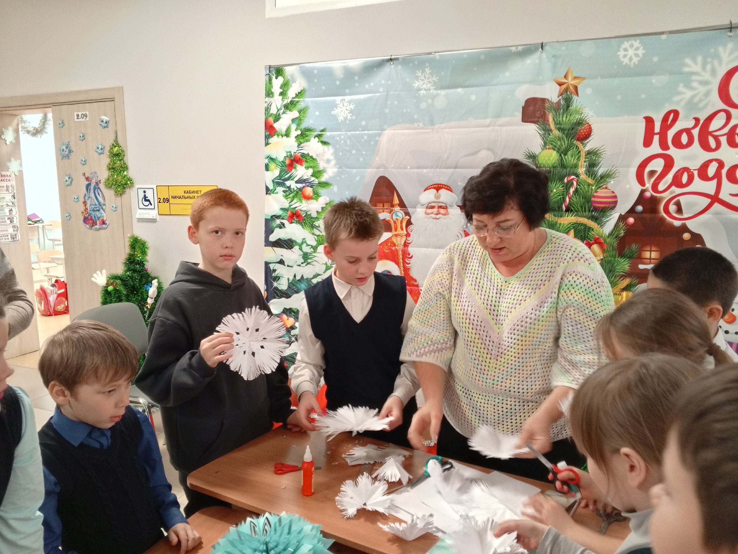 Директор школы, Наталия Александровна Табунова, лично провела мастер-класс для ребят начальной школы. Вместе с ними создавалась настоящая красота: пышные снежинки, выполненные вручную, украсили наши классы и коридоры.