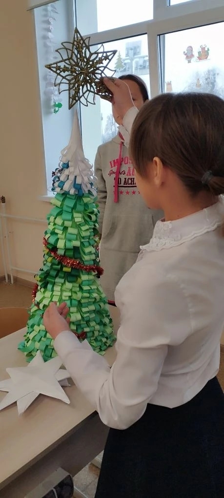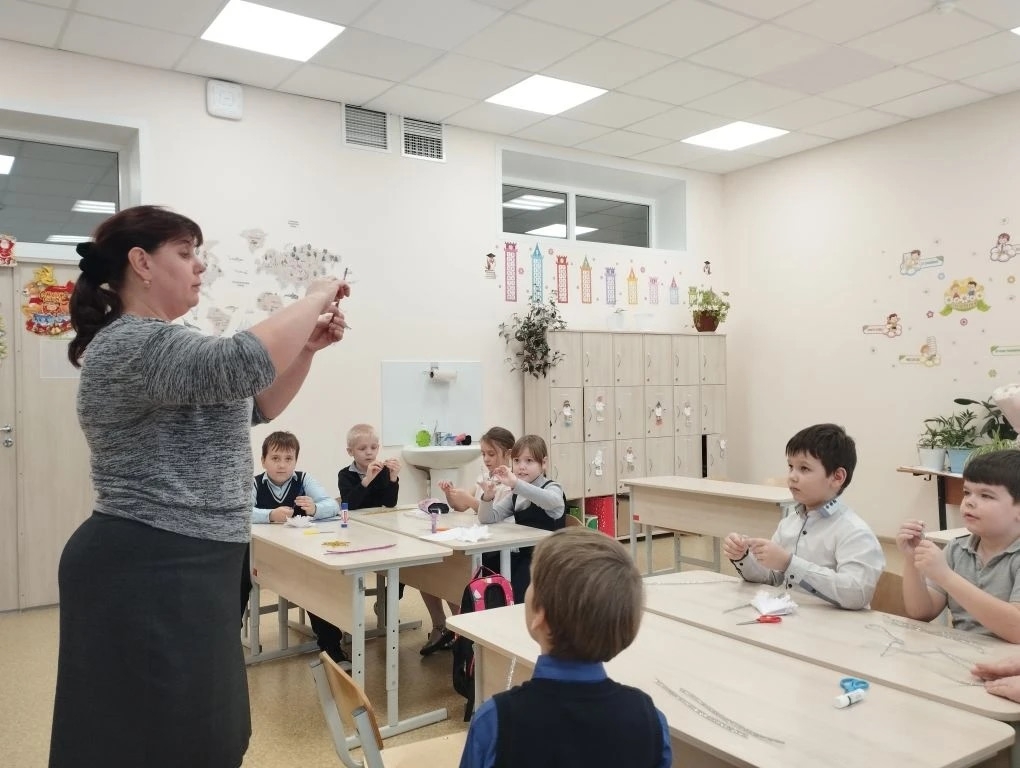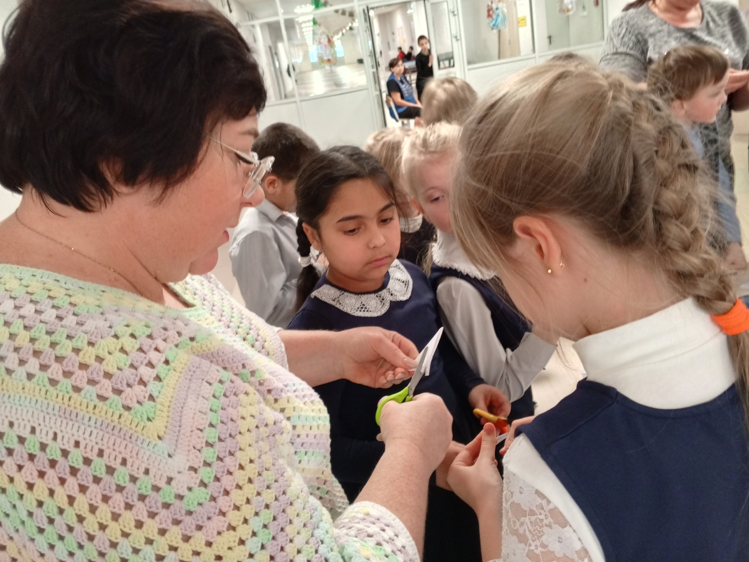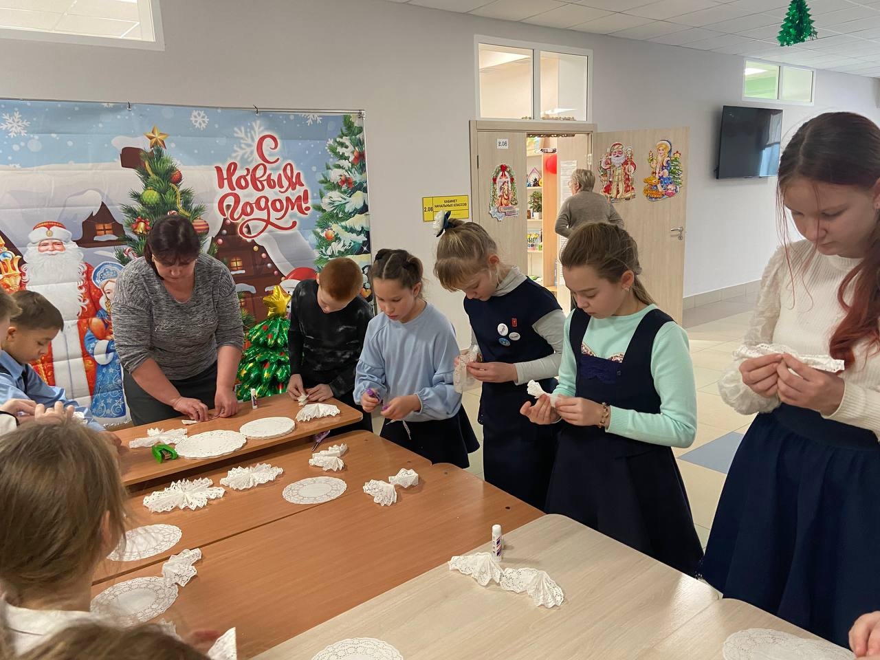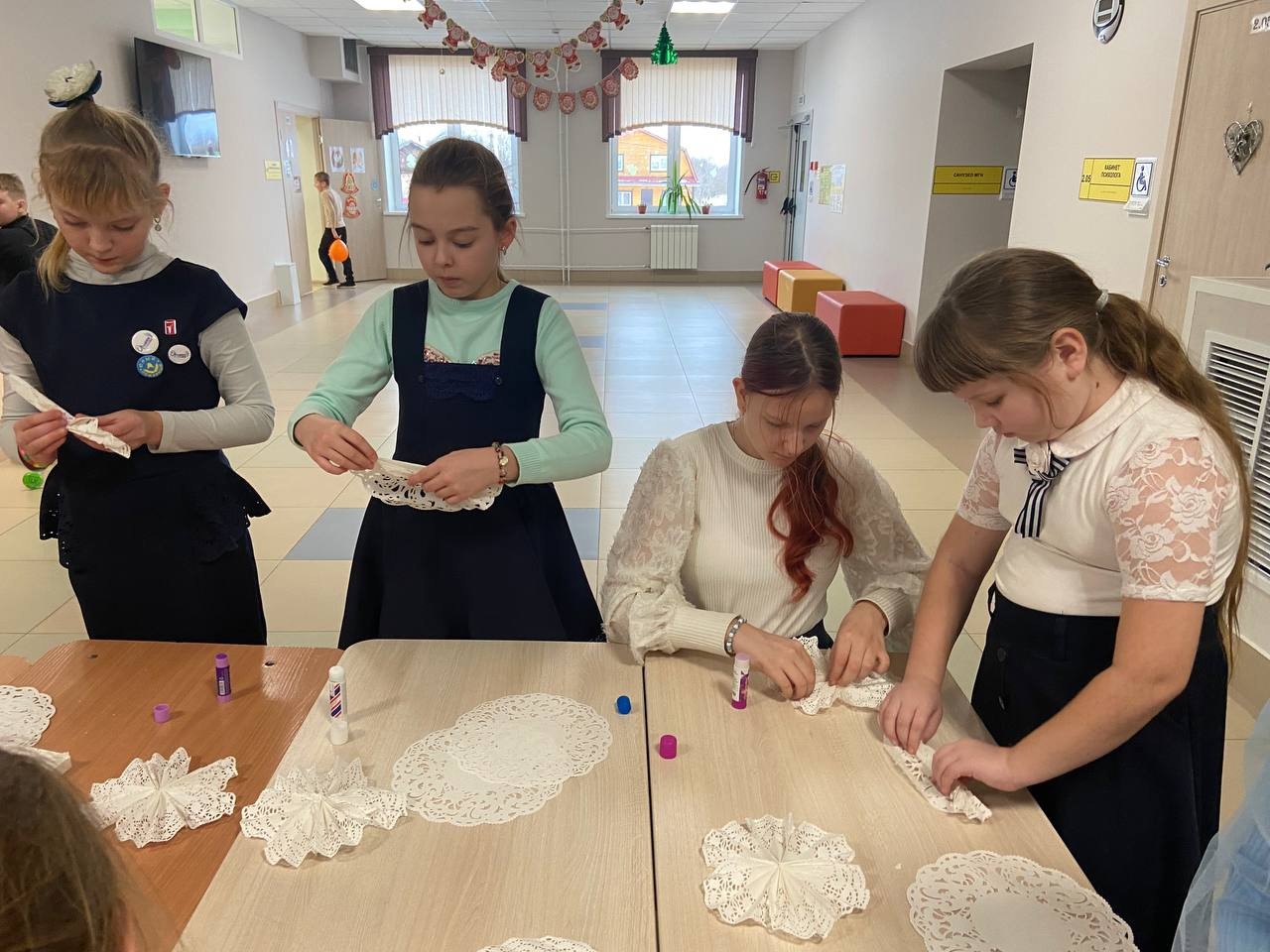 Директор школы, Наталия Александровна Табунова, лично провела мастер-класс для ребят начальной школы. Вместе с ними создавалась настоящая красота: пышные снежинки, выполненные вручную, украсили наши классы и коридоры.