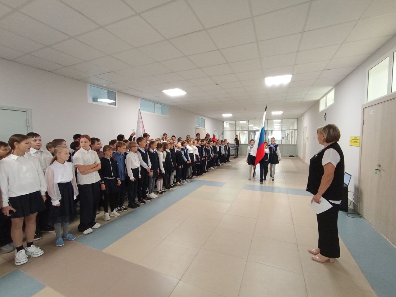 Традиционной общешкольной линейкой началась последняя неделя сентября в школе. Вынести флаг Российской Федерации предоставили юным Орлятам России, которые уже сейчас стремятся достигнуть большего: Вадим И., Ксения С., Елизавета С. Советник директора по воспитанию Гладилина О.В. познакомила с планами на неделю. Педагог-психолог Ильина Т.А. пригласила всех принять участие в добром и позитивном деле — написать «Добрые слова учителю».